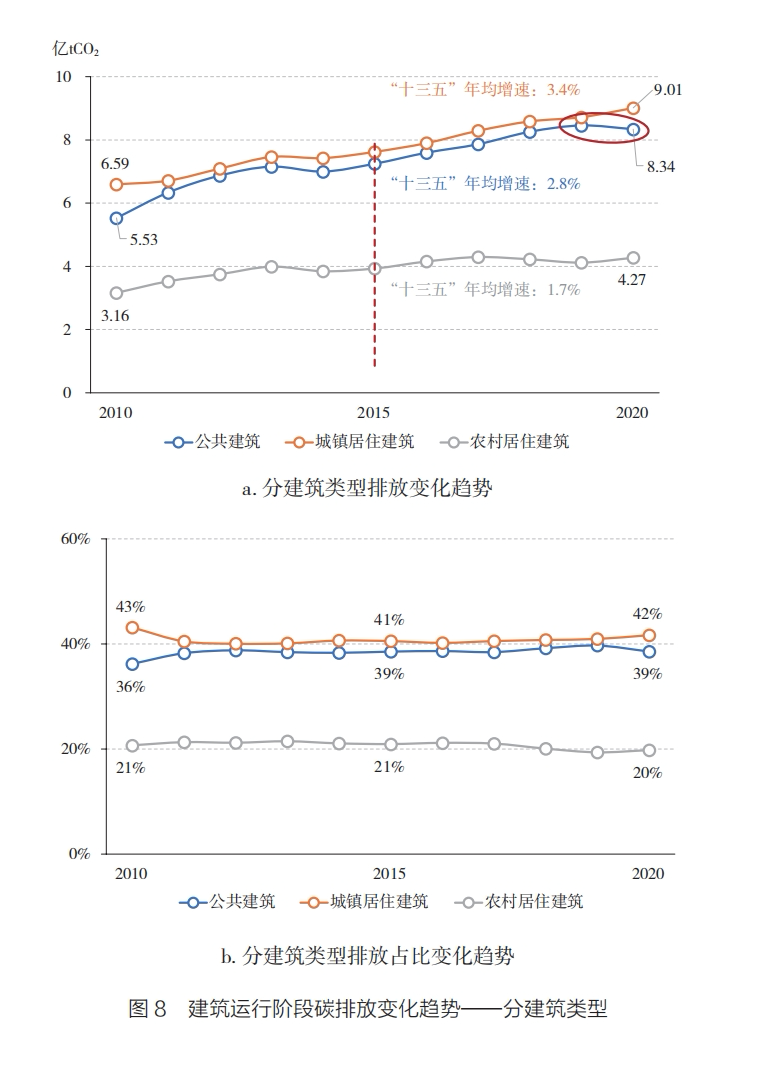 不同类型的建筑的碳排放总量的增速不尽相同,但其占比情况相对固定。总的来看,公共建筑、城镇居住建筑和农村居住建筑的碳排放比重为“4∶4∶2”,城镇居住建筑略大于公共建筑。