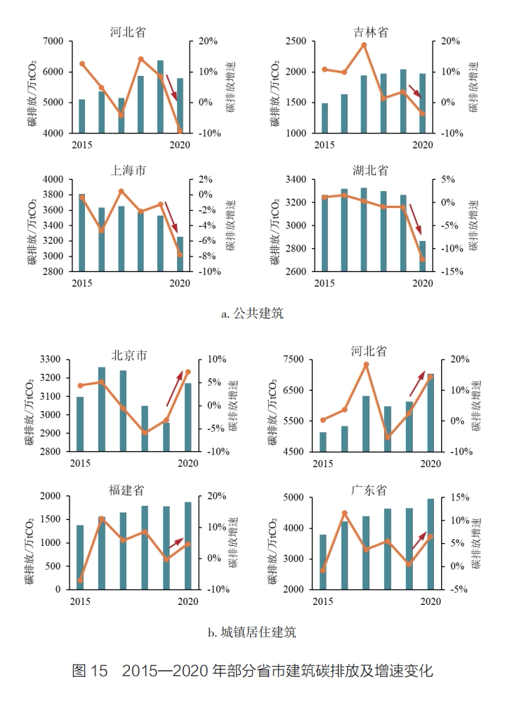 河北、福建、广东等省份2020年的排放增速也迎来新的跃升,明显高于2019年。然而,由于2019年的居住建筑碳排放增速本就较低,故2020年的增速回涨也是一种恢复正常的表现,疫情对居住建筑的影响要小于公共建筑。