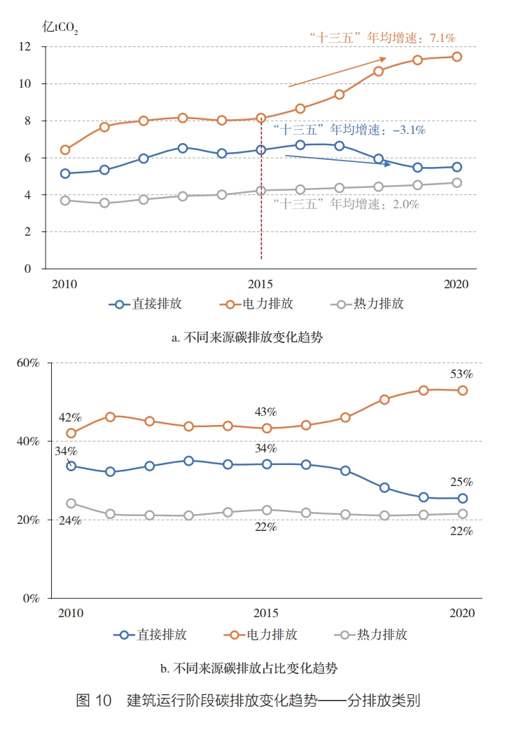 2020年建筑运行碳排放中,建筑直接碳排放5.5亿tCO2,占排放总量的25%;电力碳排放11.5亿tCO2,占排放总量的53%;热力碳排放4.7亿tCO2,占排放总量的22%。