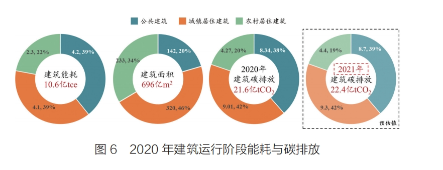 受新冠疫情影响,2020年的建筑运行能耗与碳排放增速明显放缓,全国建筑运行能耗为10.6亿tce,同比增长3.0%;碳排放21.62 tCO2,同比增长1.5%。此外,参考2021年我国能源消费总量数据,并根据各建筑类型能耗占比与历年增长趋势对2021年的建筑碳排放情况进行预估,预计2021年我国建筑碳排放将回归正常增长速度,达到22.4亿tCO2。