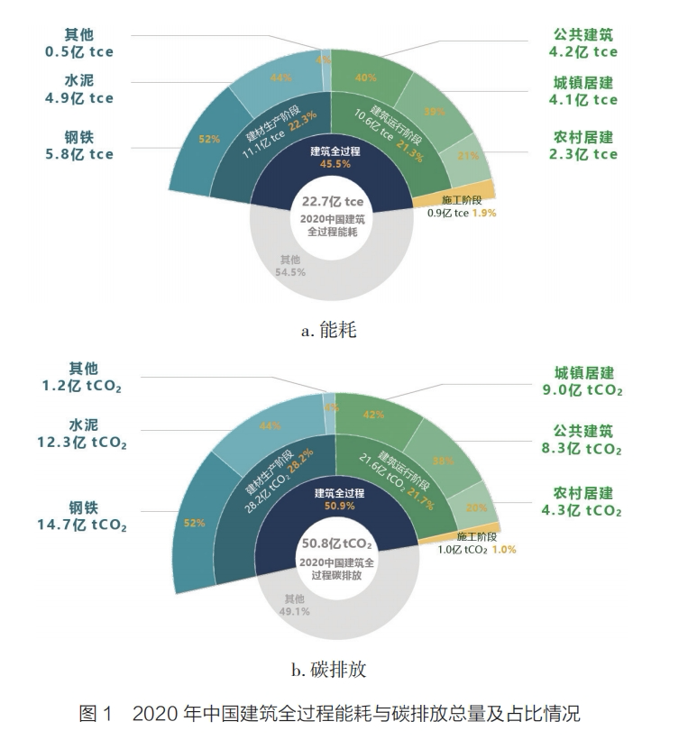 2020年全国建筑全过程碳排放总量为50.8亿tCO2,占全国碳排放的比重为50.9%。其中:建材生产阶段碳排放28.2亿tCO2,占全国碳排放总量的比重为28.2%;建筑施工阶段碳排放1.0亿tCO2,占全国碳排放总量的比重为1.0%;建筑运行阶段碳排放21.6亿tCO2,占全国碳排放总量的比重为21.7%。