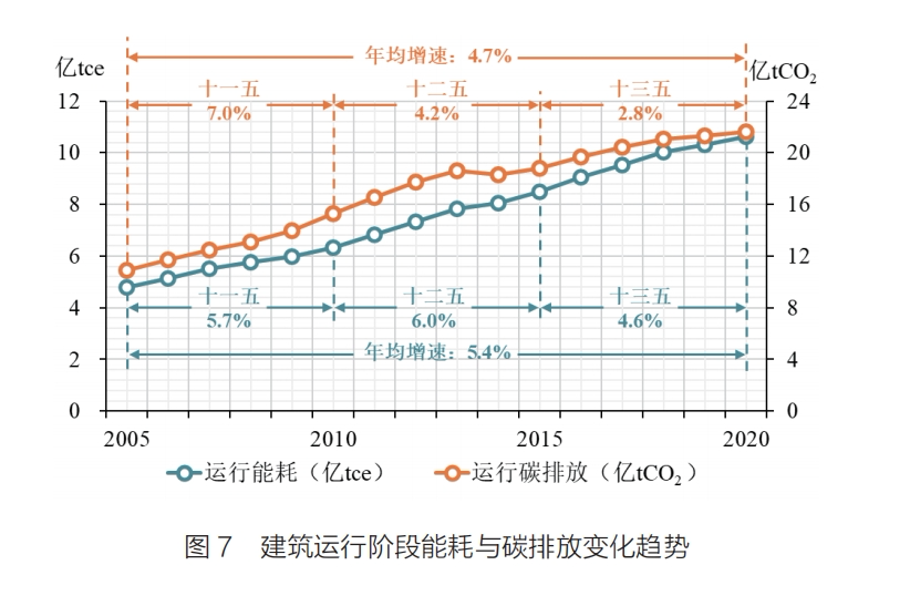 2005—2020年,全国建筑全过程能耗由9.5亿tce,上升至22.7亿tce,是原来的2.4倍,年均增速为6.0%。“十一五”“十二五”和“十三五”期间的年均增速分别为6.0%、8.3%和3.7%。