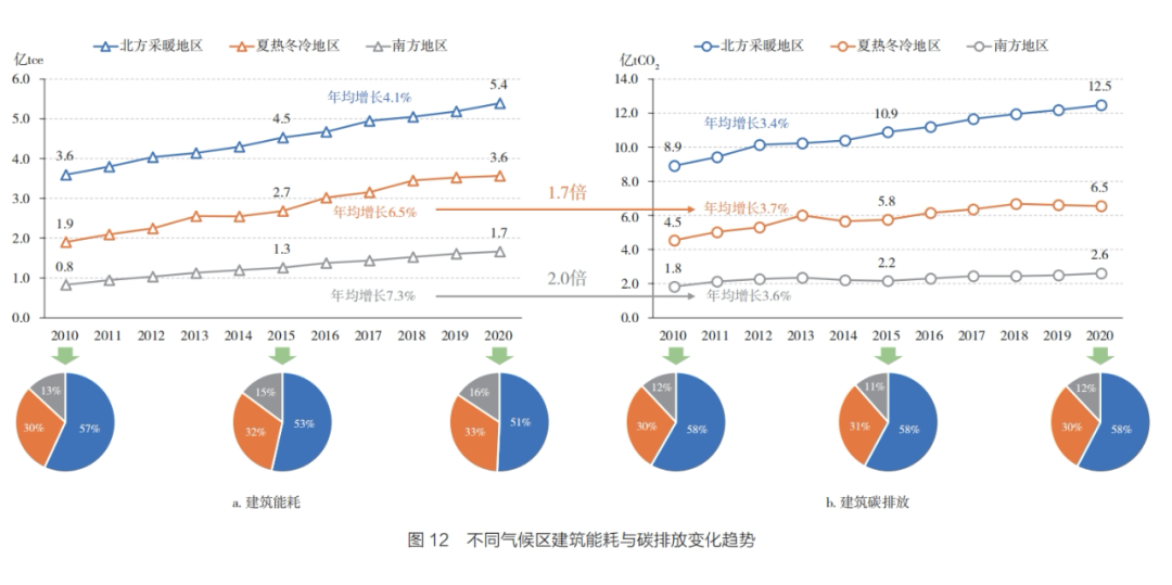三大地区的建筑碳排放占比相对稳定,北方地区排放占比常年维持在58%左右。