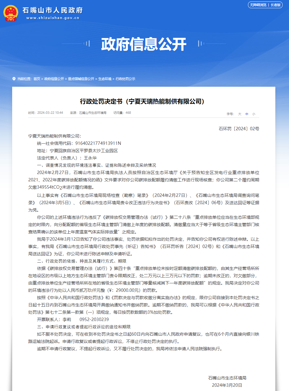 信用中国公开信息显示,某热能企业因未在规定时间完成2023年碳排放配额清缴,被宁夏回族自治区生态环境部门依法处以重罚。该公司2023年度(第三个履约周期)应清缴碳配额5128612吨CO₂,仅完成4263312吨,未履约量865300吨,未按规定于2024年12月31日前完成清缴,违反《碳排放权交易管理暂行条例》第十四条规定。鉴于公司后续积极整改,已购入足额碳配额,参照相关裁量标准,依据《碳排放权交易管理暂行条例》第二十四条,按未清缴配额清缴时限前1个月市场均价(98元/吨)的5倍罚款,共计423997000元(约4.24亿)。