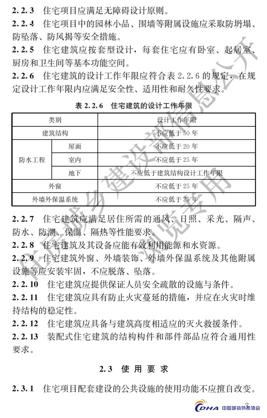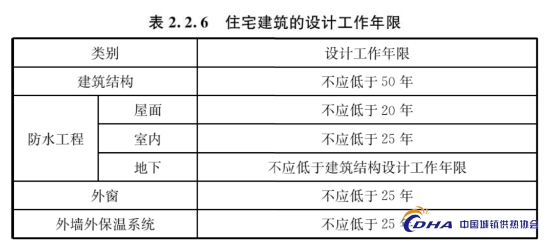 2.2.6 住宅建筑的设计工作年限应符合表2.2.6的规定,在规定设计工作年限内应满足安全性、适用性和耐久性要求。