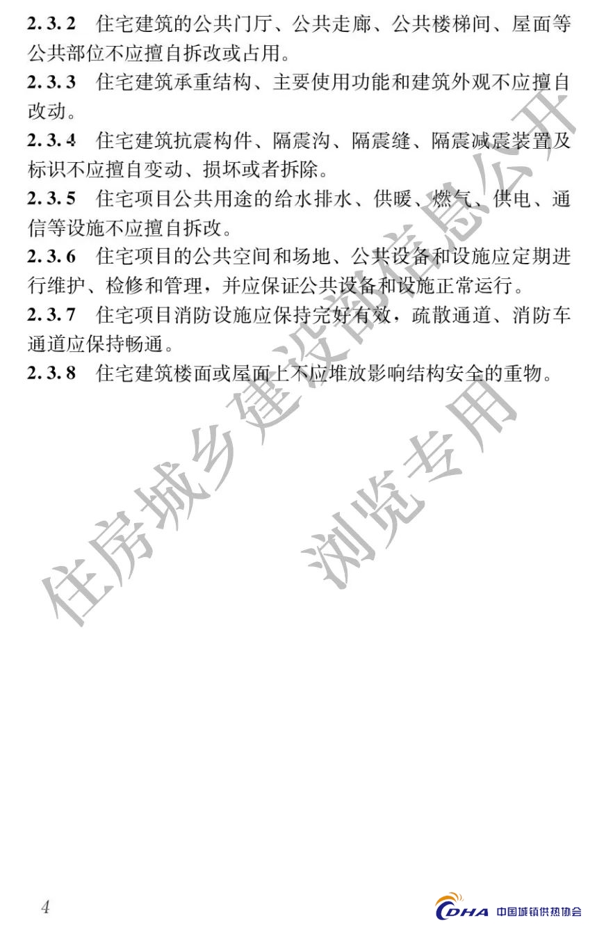 2.3.5 住宅项目公共用途的给水排水、供暖、燃气、供电、通信等设施不应擅自拆改。