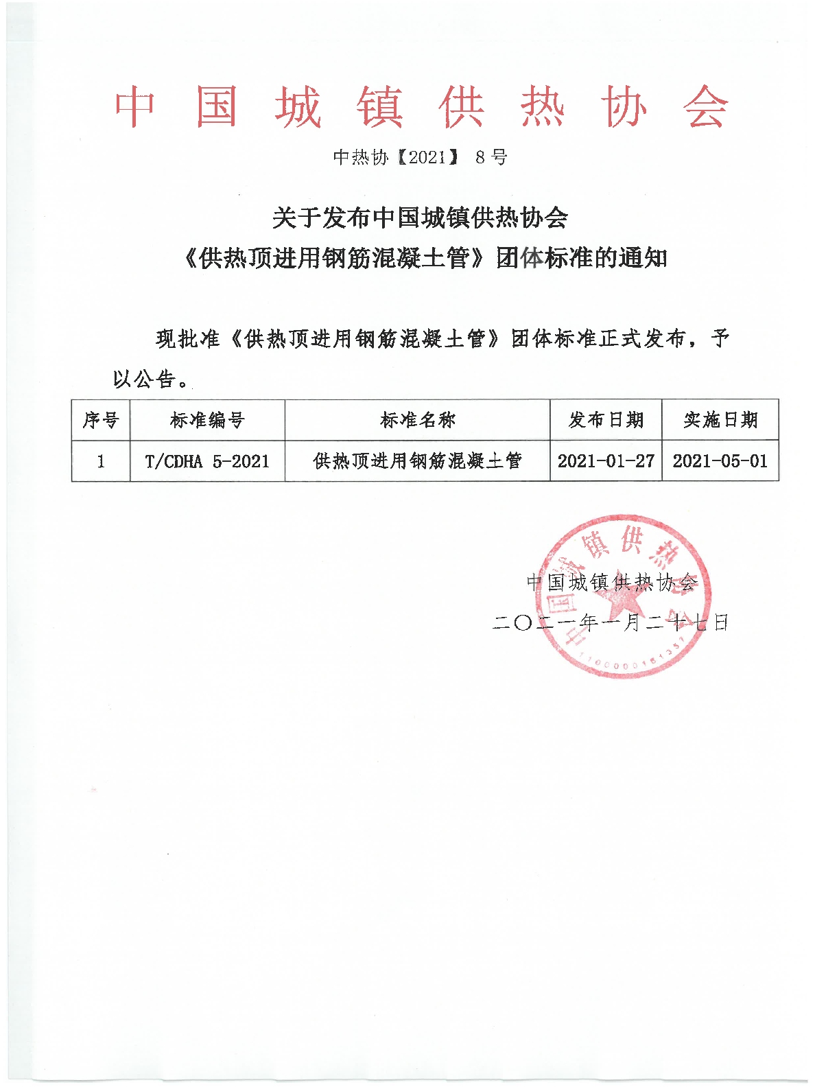 关于发布中国城镇供热协会《供热顶进用钢筋混凝土管》团体标准的通知