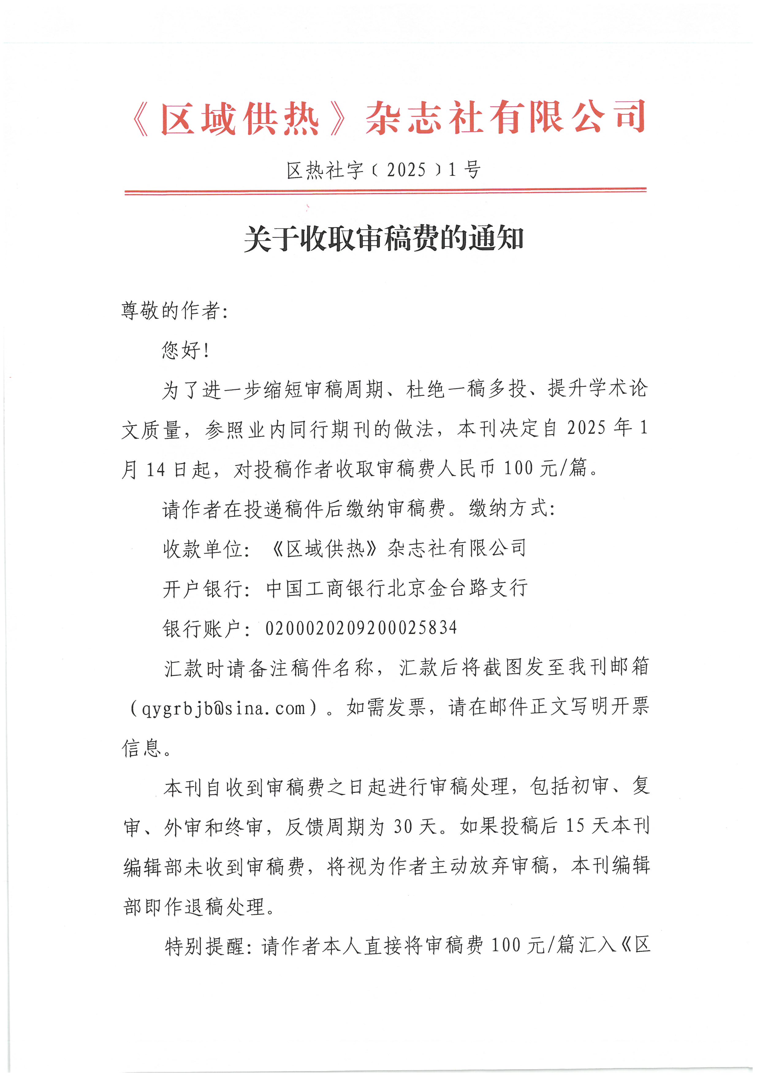 关于收取审稿费的通知