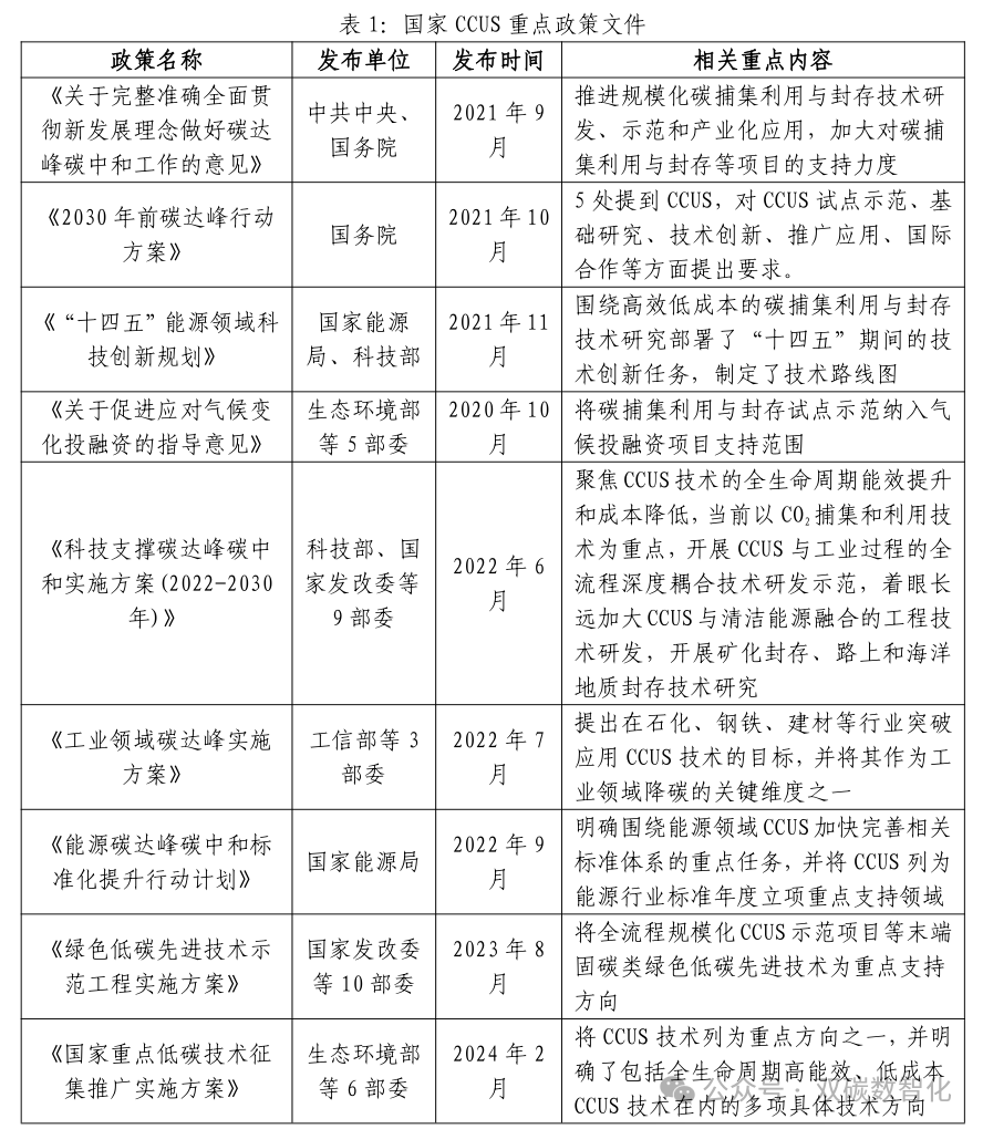 2020年9月碳达峰碳中和目标提出后,国家各部委和地方政府先后出台相关政策文件,对CCUS 技术研发、标准和融资等方面作出积极部署,逐步推动 CCUS 技术的研发和规模化应用。截至目前,我国已发布的CCUS 相关政策文件涵盖发展规划、技术标准、试验示范、技术目录等方面,CCUS 政策体系初具雏形。重点政策如下: