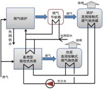 为充分挖掘燃气锅炉潜力,采用燃气驱动吸收式热泵直接接触换热烟气余热回收技术回收尾部烟气热量(见图1),锅炉排烟温度降至25-30℃,效率提升约10%,氮氧化物降低约8%,同时,可实现锅炉烟气“消白”和冷凝水回收利用。