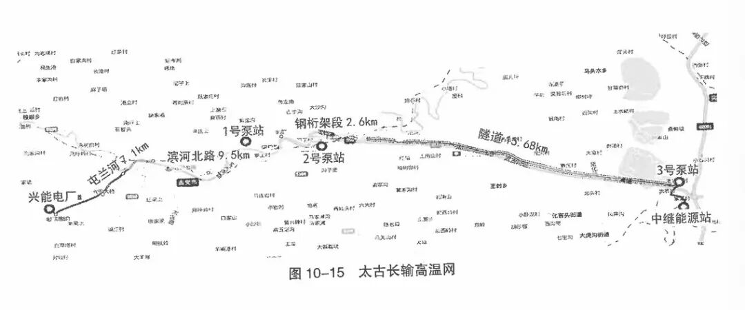 太古热源为古交兴能电厂,供热机组共6台,热源配套8台循环泵,具体参数见表10-1所示。兴能电厂通过37.8公里长输管线(图10-15),沿途布设3处中继泵站,1处中继能源站,共配套40台循环泵维持运行,如图10-16所示。太古热区承担着太原市区6000万-8000万㎡的供热负荷,一旦发生故障,影响极为重大。