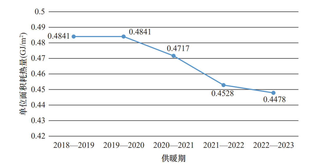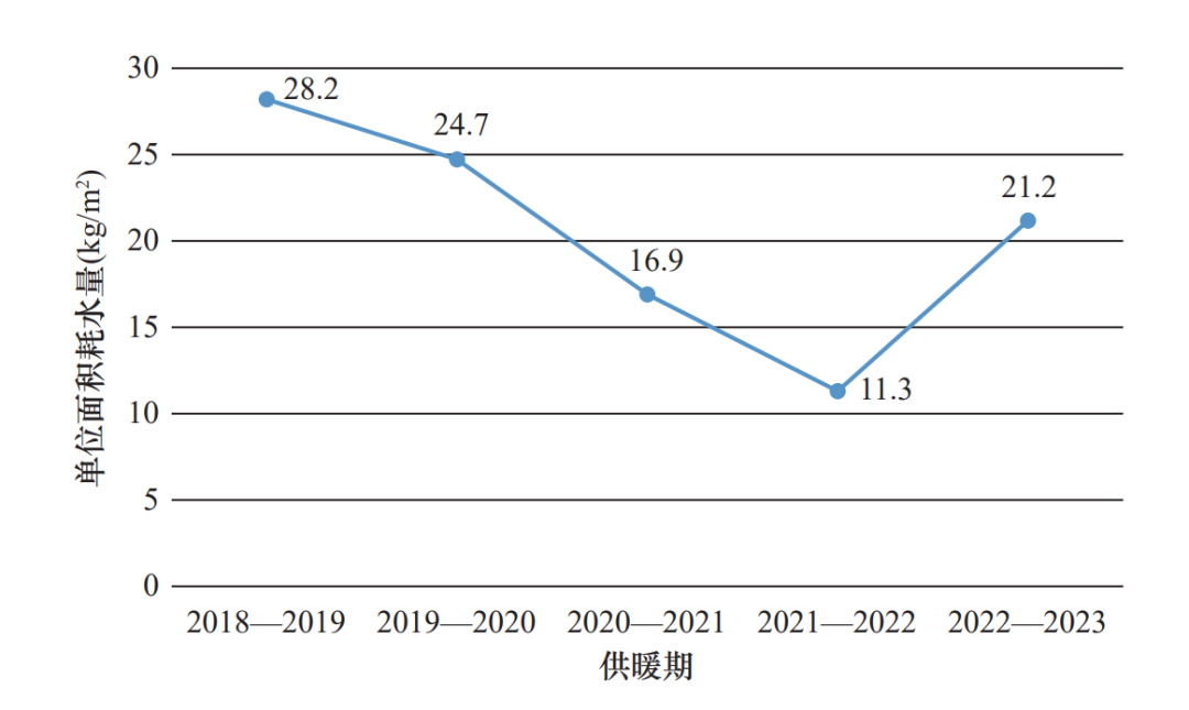 相较于“查隐患、保安全、降能耗”实施前,乌鲁木齐热力的单位面积耗热量下降了约7.5%,单位面积耗水量下降了约60%(2022-2023供暖期检维修工作未能正常开展),单位面积耗电量下降了10%以上(图1~图3)。目前乌鲁木齐热力的水耗管控工作已经达到了行业领先水平,热耗和电耗正在稳步下降,每年可减少数千万元的生产成本,有力地推动了企业的良性可持续发展。