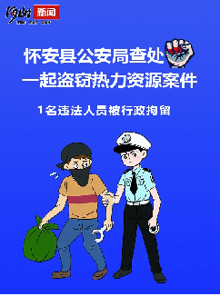 2024年1月,怀安县公安局查处一起盗窃热力资源案件,1名违法人员被行政拘留。
