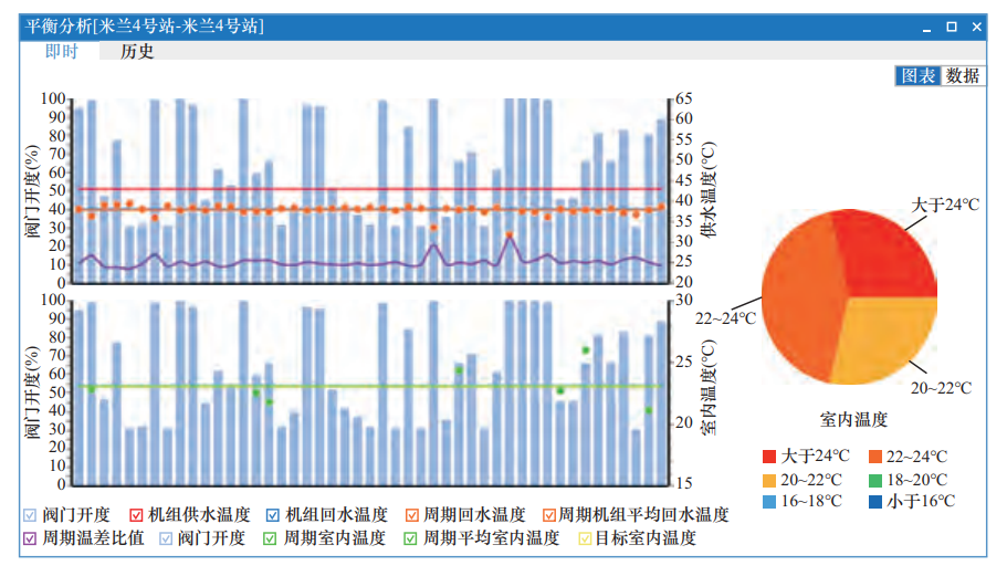 第二,按照不同类型(中间单元、边角单元、别墅)分别按照对应的室内温度数据分析回水温度调节系数,提高控制精度,实现精细化调整,并通过手持流量计进行现场详细测量和验证(米兰世纪小区4号站平衡分析图见图2)。