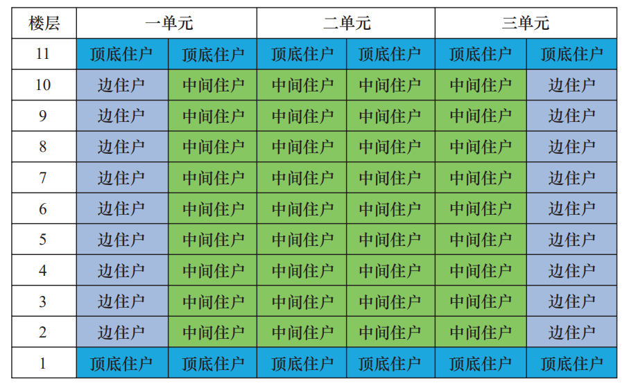 室内温度采集器安装在具有代表性的室内供暖区域,考虑到用户接受程度和使用效果,拟选取10%的用户作为典型用户进行安装,典型用户的选取要考虑到边住户、顶底住户、中间住户、最不利工况用户等,覆盖绝大部分用户的用热形式及围护结构(图1)。
