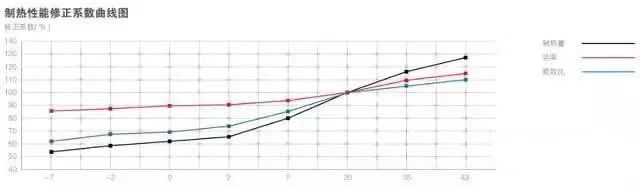 故机组选型时,需考虑工程所在地的冬季平均温度,根据冬季平均温度来考虑机组在冬季的衰减。冬季平均温度与机组冬季衰减关系见能效比曲线表。