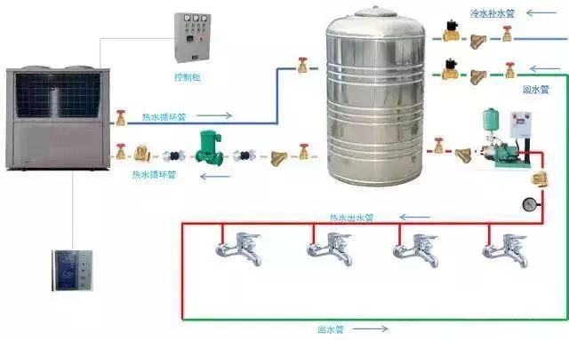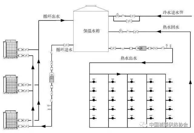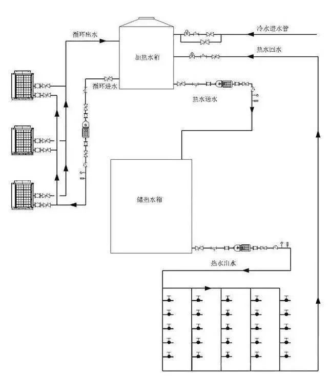 循环大小水箱工程系统图循环机组使用加热水箱和储热水箱分离设计,机组集中热量加热小水箱(加热水箱),时期温度到达设定温度后将热水放至大水箱(储热水箱),如此循环动作。此系统适用于连续性供水且热水需求量较大的酒店、宾馆、工厂、医院等场所,水温波动小。