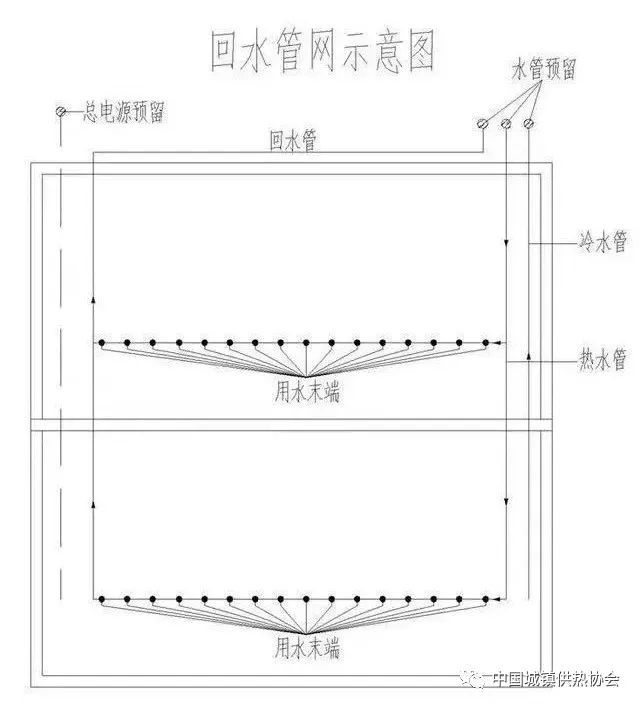 当用户长时间不用时,水管中的水温降低,为了节约用水,水管中的水自动回到水箱中。回水管路安装电磁阀,当会管道水温小于设定的回水温度且低于水箱温度5度时,电磁阀开启,增压水泵开启,将水管中的冷水排放到水箱中。当管道温度高于设定温度,电磁阀与水泵停止工作,保证用户一开龙头就有热水出水。