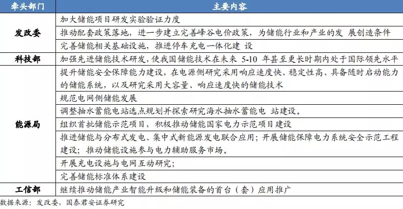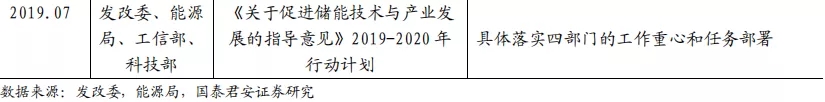2019-2020 年行动计划出台,各部门各司其职保障储能产业化应用。2017年发改委等五部门联合发布《关于促进储能技术与产业发展的指导意见》,其中明确提到在十三五期间储能产业发展进入商业化初期,十四五期间储能储能产业规模化发展。2019 年 7 月为进一步的贯彻落实该项指导意见,发改委等四部门发布 2019-2020 年行动计划,其中对发改委、科技部、工信部、能源局的工作任务都做了详细部署,进一步推进我国储能技术与产业健康发展。