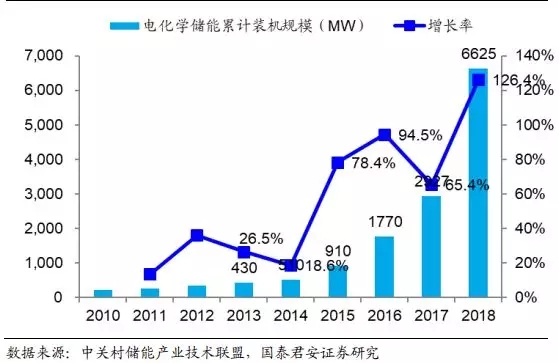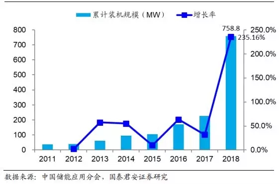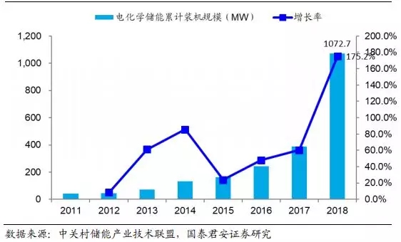 图18:2018 年全球电化学储能装机规模同比增长超过 100%
