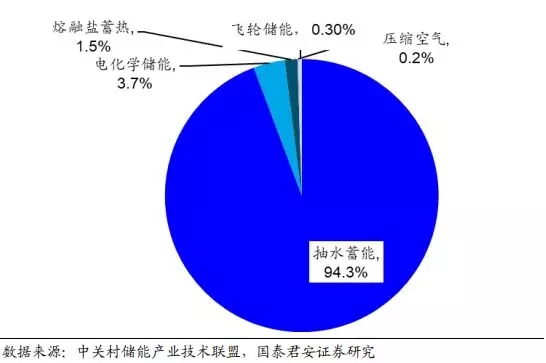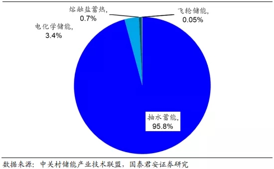 中国市场与全球类似,抽水蓄能占据主导地位。在储能装机的类型分布中,我国呈现与全球类似的特点,根据 CNESA 数据统计显示,截止 2018年底我国储能整体装机中抽水蓄能占比达到 95.8%,电化学储能与其他储能方式共存,其中电化学储能市场占比为 3.4%,熔融盐蓄热储能市场占比 0.7%,而飞轮储能,压缩空气储能市场占比均不足 0.1%。