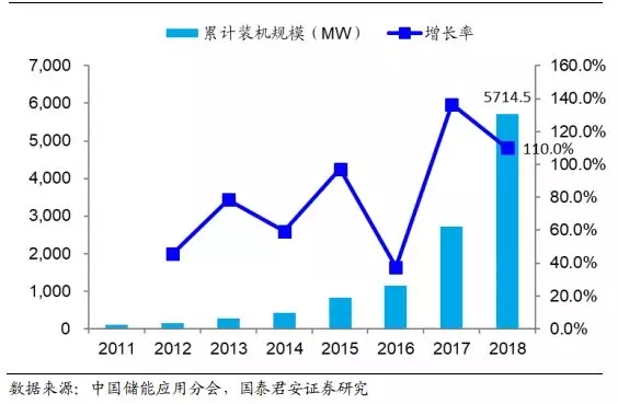 抽水蓄能的主导地位仍然不会改变。抽水蓄能属于大规模、集中式能量储存;其技术非常成熟,每瓦储能运行成本较低,可用于电网的能量管理和调峰;但其建设完全依赖于地理条件,即当地水资源的丰富程度, 并且一般与电力负荷中心有一定的距离,面临长距离输电的问题。2016 年以来全球抽水蓄能的装机增速持续下降,2018 年装机增速仅为 0.6%;而从我国的情况来看,2018 年我国抽水蓄能装机规模同比增速为 5.3%,高于全球水平。短期来看我们认为抽水蓄能成本更加的便宜,并且随着特高压输电的不断建设,电力损耗有望进一步减少,抽水蓄能在储能应用中的主导地位短期内仍然不会被动摇。