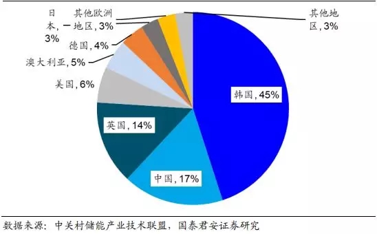 全球电化学储能装机量持续攀升。截至 2019 年一季度,全球电化学储能累计装机规模为 6829MW,是 2010 年累计装机规模的 17 倍。2018 年电化学储能装机呈井喷状态,全年新增装机量高达 3698MW,同比增速达到 126.4%。从新增装机国家来看:韩国占到全球 2018 年新增电化学储能装机量的 45%,遥遥领先于其他国家;其次中国、英国、美国和澳大利亚分别占比 17%、14%、6%及 5%,剩余国家合计新增电化学储能装机占比 13%。