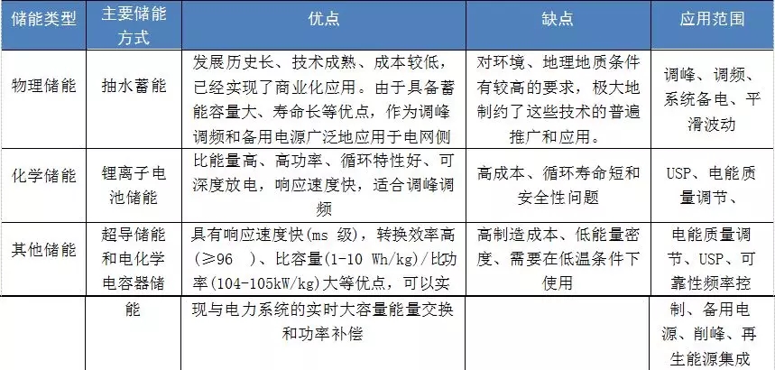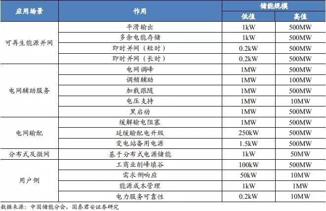 表1 储能应用场景广泛,包括电网侧、可再生能源并网、用户侧等方面