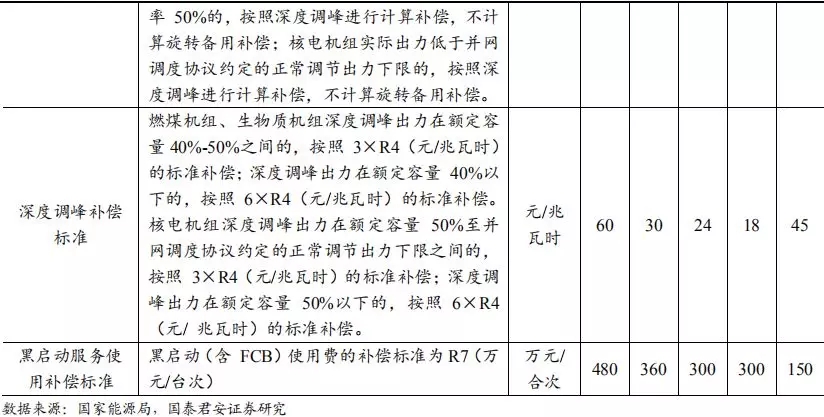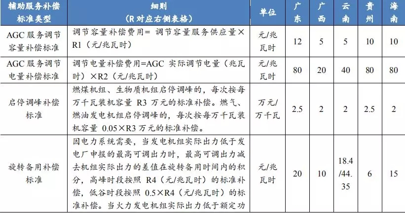 表6:南方地区电力辅助服务补偿机制