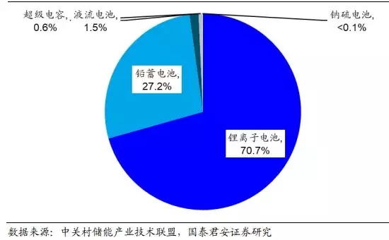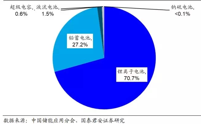中国电化学储能市场以锂离子电池储能为主导,铅蓄电池储能是重要组成部分。在 2018 年中国电化学储能新装机分布中,锂离子电池以 70.6% 的装机占比占据主导地位;铅蓄电池是电化学储能市场的重要补充,新装机量占比达到 27.2%;其余电化学储能方式如液流电池、超级电容、钠硫电池占比合计仅为 2.2%。