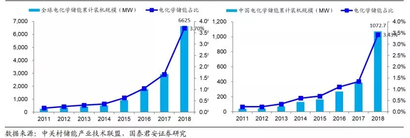 图16:全球和中国电化学储能规模占比逐年上升