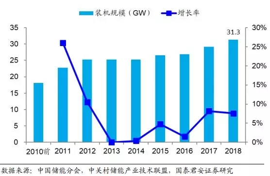 2013 年以前受益于国家对水电站的大力投资建设,抽水蓄能得以快速发展,随后我国储能项目整体进入平稳发展趋势。2017 年发改委、科技部、能源局、财政部和工信部联合发布《关于促进储能技术与产业发展指导意见》,其中明确提到:1)“十三五”期间,建成一批不同技术类型、不同应用场景的试点示范项目,储能行业进入商业化发展初期;2)“十四五”期间,储能项目广泛应用,形成较为完整的产业体系,成为能源领域经济新增长点;储能行业进入规模化发展阶段。受此拉动我国储能装机规模快速提升,截至 2018 年底我国储能累计装机量达到 31.3GW,是2010 年累计装机量的 1.7 倍,占全球市场总规模比重达到 17.3%,中国市场已成为全球市场重要组成部分。