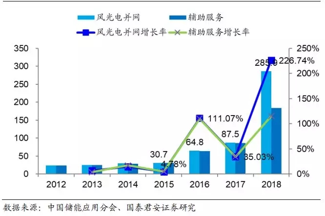 锂电储能技术在可再生能源并网和电网侧装机增长显著。在 2012 年, 锂电储能技术在风光电并网和辅助服务的累计装机量仅为 23.9MW、23.7MW。自 2016 年起,全国各地方储能产业政策不断出炉,推动了储能产业的快速发展,锂电储能在风光电并网和电力辅助服务上装机量攀升,2018 年累计装机同比增速高达 226.7%、115.1%,累计装机量分别为285.9MW、184.3MW。目前仍有大量风光发电站和热电厂未装备有调峰调频储能设备,锂电储能技术在风光电并网和辅助服务侧存在广阔的市场。