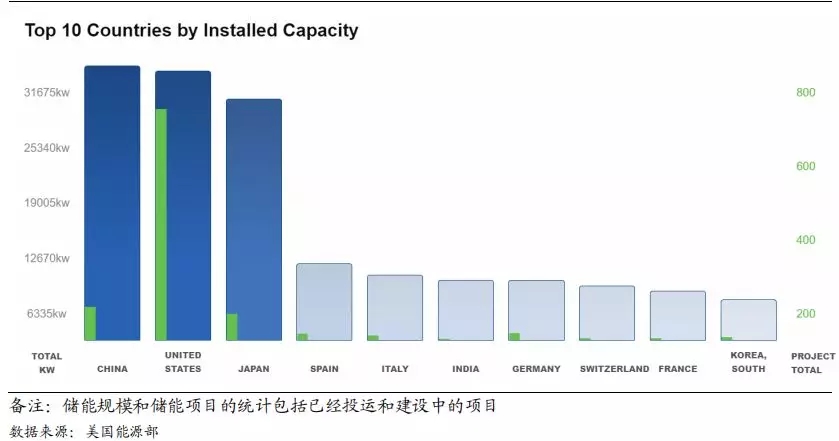 中国储能装机规模位列全球第一,美国、日本分列二三位。根据中关村储能技术联盟数据统计,中国装机规模达到 31.3GW,占全球装机总量17.3%,装机规模位列全球第一。同样的在美国能源部的统计中我们也可以看到从装机规模来看中国位列全球第一(美国能源部统计的装机规模包括已经投运的项目和在建的项目),美国装机规模位列全球第二,但其储能项目数量位列第一。日本市场尽管其国土面积较小,但其整体装机规模同样在 30GW 左右,位列全球第三;西班牙、意大利、印度、德国、瑞士、法国、韩国分别四至十名,但与前三名相比装机规模存在显著差距。