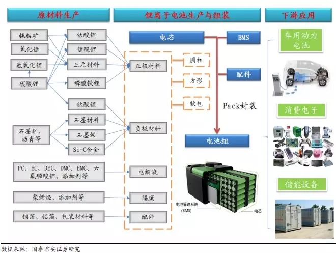 中游电池材料和电池以及下游的动力电池、消费电池和储能电池应用
