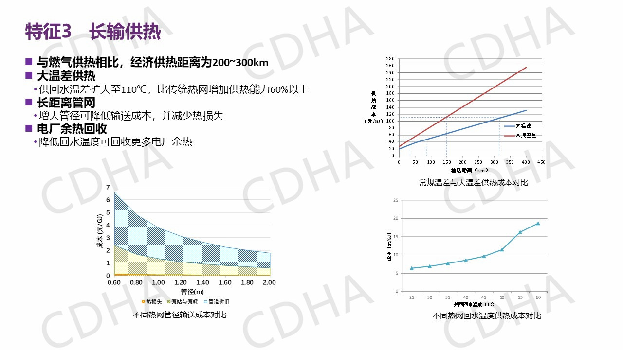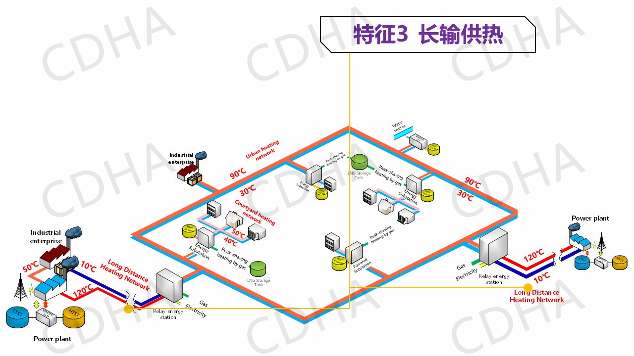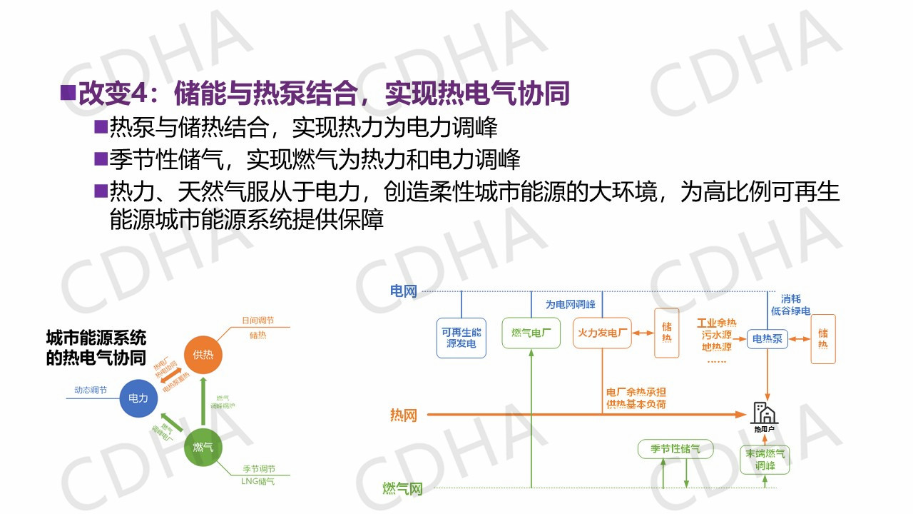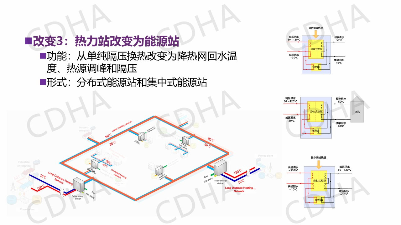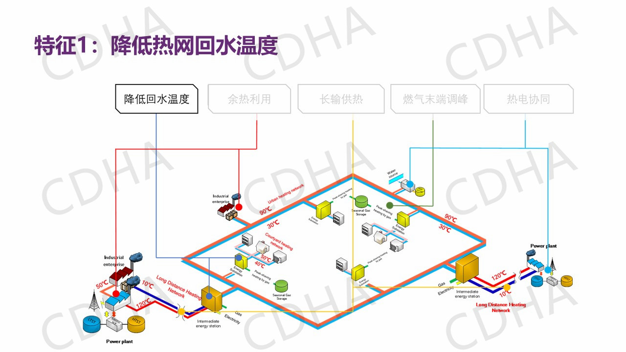 那么这些特征我说完之后,我想把它再进一步的归纳总结到系统里边,城市里面这种供热系统该是什么样的,该有哪些改变?我们总结了四点,也就是说以余热为主的、低品位的热源取代燃煤为主的锅炉,这是我们热源的一个改变。第二个改变,我们要增设像储热、储气和热泵等设施,实现热电气协同。第三个改变,我们要建立以实现降低回水温度为主要目标的能源站。第四个改变,由于我们增加了长输管网,从参数上我们是三级系统,而不是过去的二级管网。