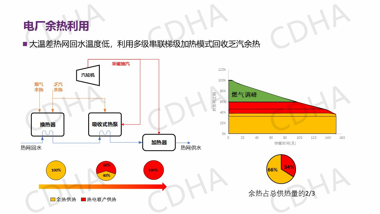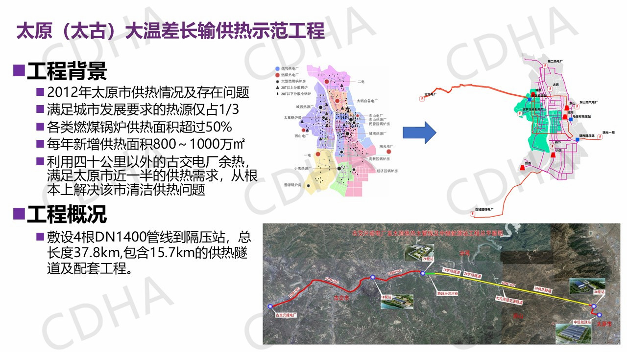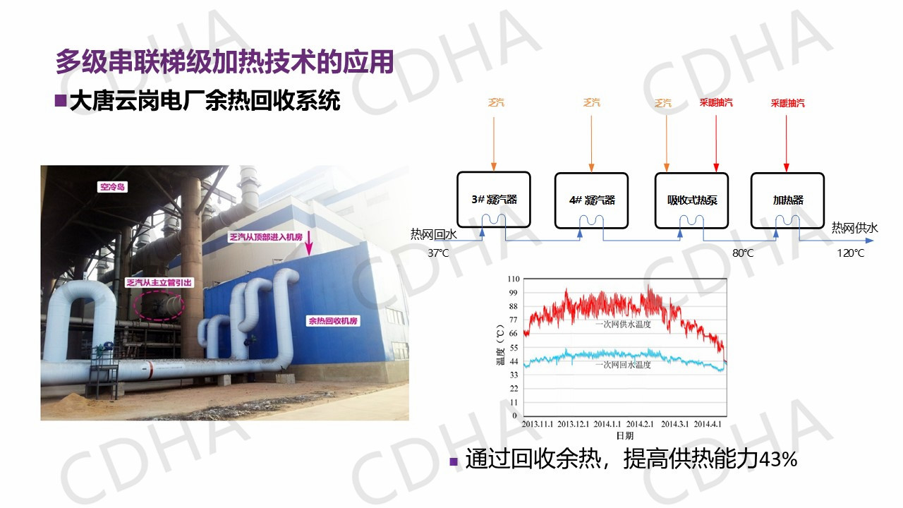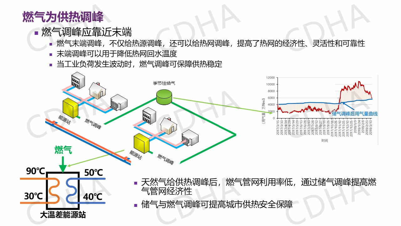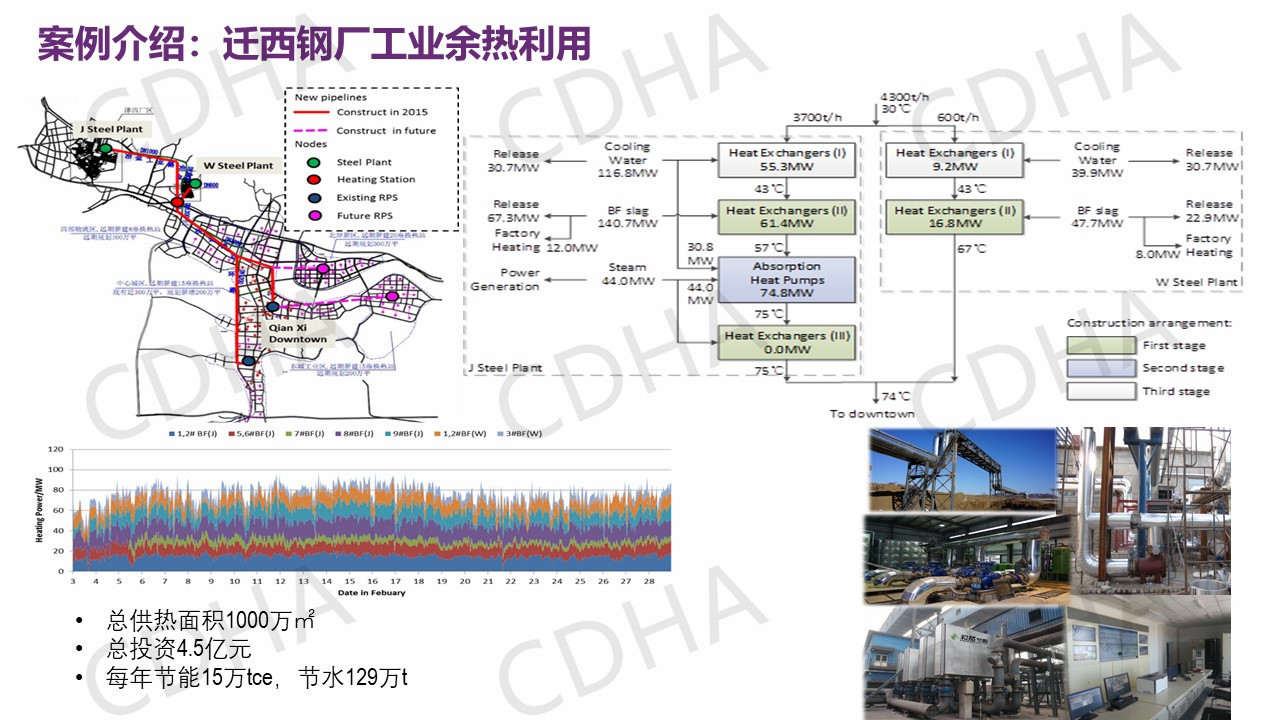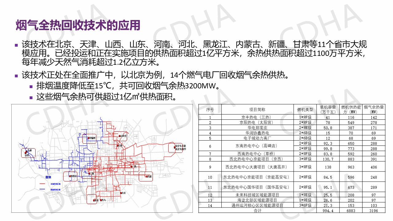 我要介绍的最后一个是效果。因为以电厂余热和工业余热为主的能源供热,用不到10%的燃气做调峰,对比一下它的效果就是能耗比锅炉可以下降90%,污染排放降低90%,而它的成本和燃煤锅炉相当,不到天然气的一半。