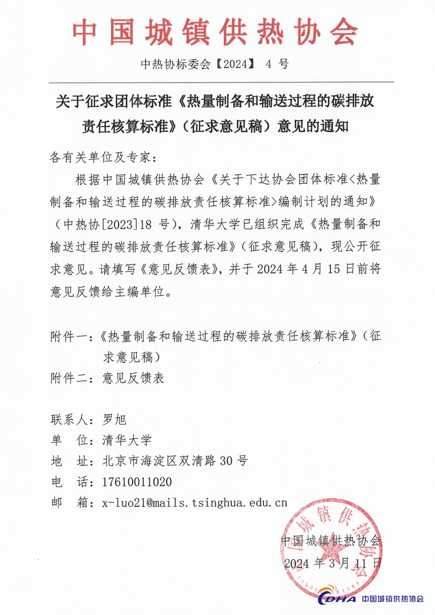 关于征求团体标准《热量制备和输送过程的碳排放责任核算标准》(征求意见稿)意见的通知