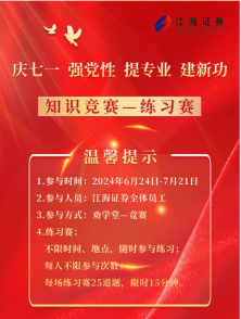 为深入学习贯彻习近平新时代中国特色社会主义思想和党的二十大精神,落实证监会系列监管要求,持续加强党员干部队伍建设,江海证券有限公司开展“庆七一 强党性 提专业 建新功”知识竞赛活动。活动题库涵盖了中央金融工作会议、习近平在省部级主要领导干部推动金融高质量发展专题研讨班、“315”系列新规、新国九条、党的二十大精神、党纪法规、企业文化建设、合规文化宣导、风险控制文化宣导、员工执业行为、廉政教育、普法知识、廉洁从业等15方面内容。截至目前,参与人员覆盖公司所有条线、部门及各基层党支部,党员参与率达100%,总人次高达10252。