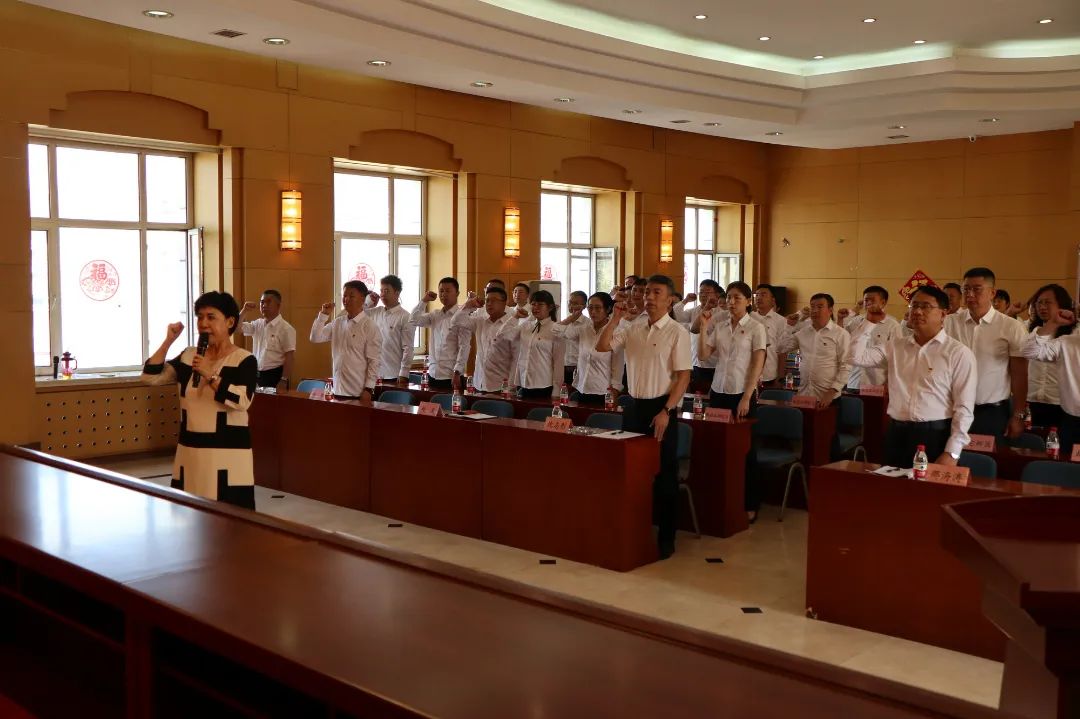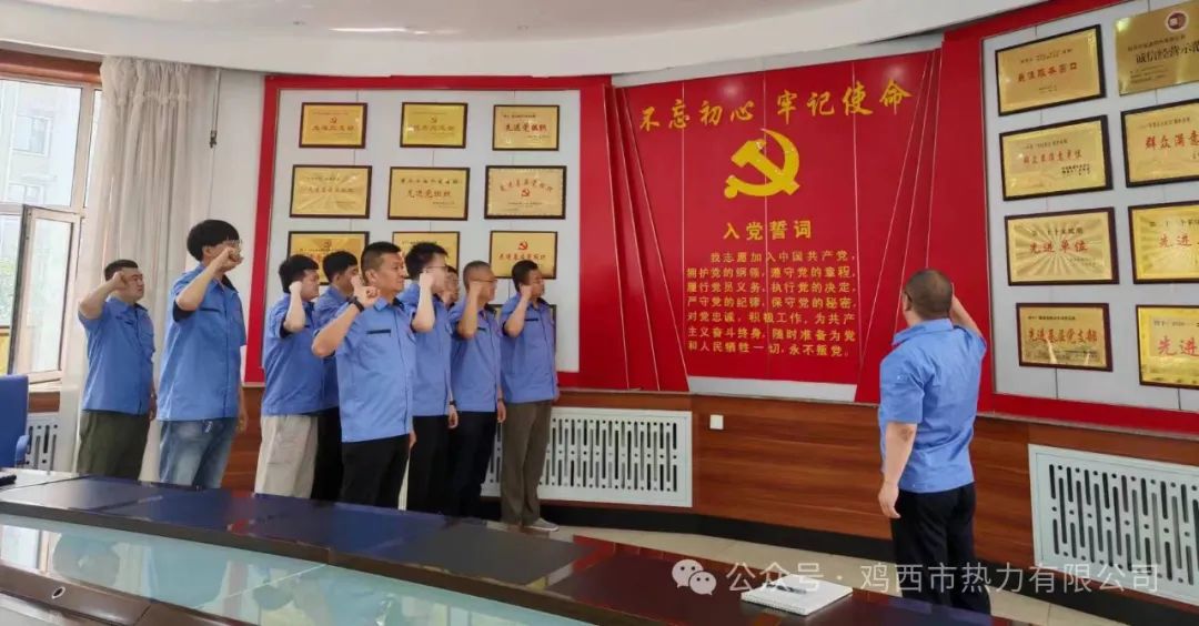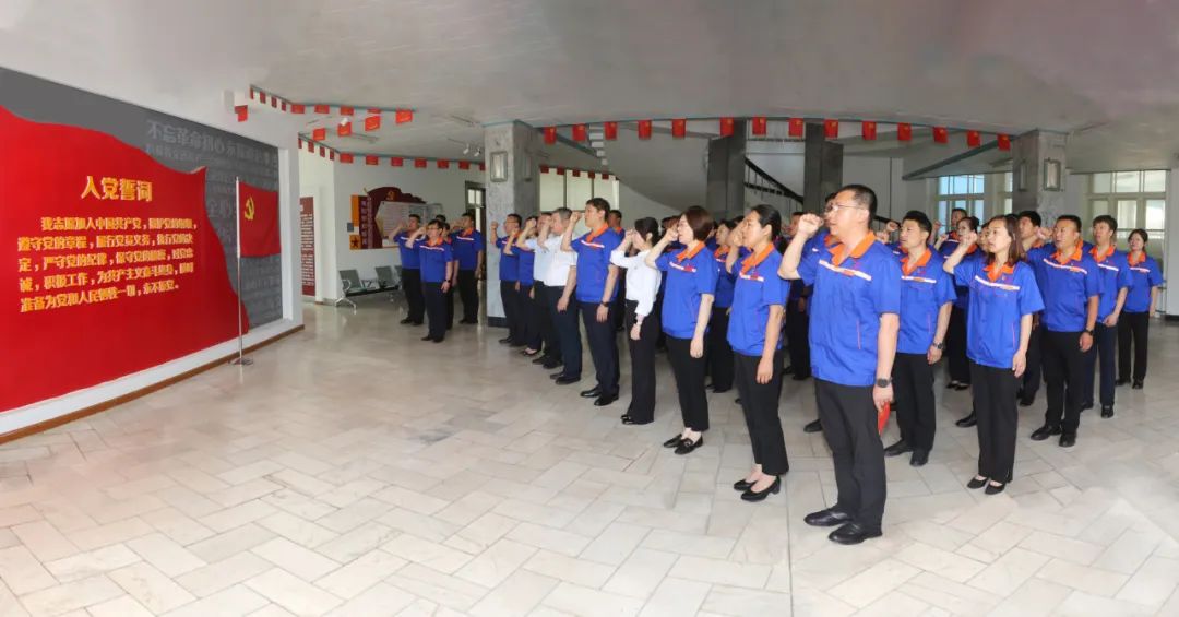 5名新党员和全体老党员在集团公司党委书记、董事长辛奇云带领下面对党旗庄严宣誓,许下自己忠诚于党、忠诚于人民的铮铮誓言。