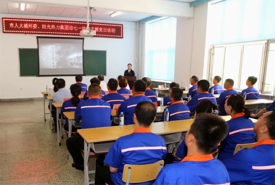 6月28日上午,市人大城环委联合阳光热力集团,在市委组织部党建活动基地开展迎七一主题党日活动,重温党的光辉历程,弘扬伟大建党精神。市人大城环委主任委员王文峰及市人大城环委委员,阳光热力集团董事局主席、总裁宋佳鑫及阳光热力集团党委委员、各子公司党支部委员和党员骨干代表共计50余人参加活动。