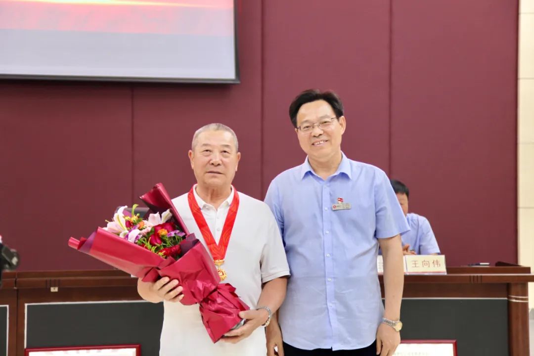 集团公司党委书记、董事长辛奇云为“光荣在党50年”党员张荣同志颁发纪念章。