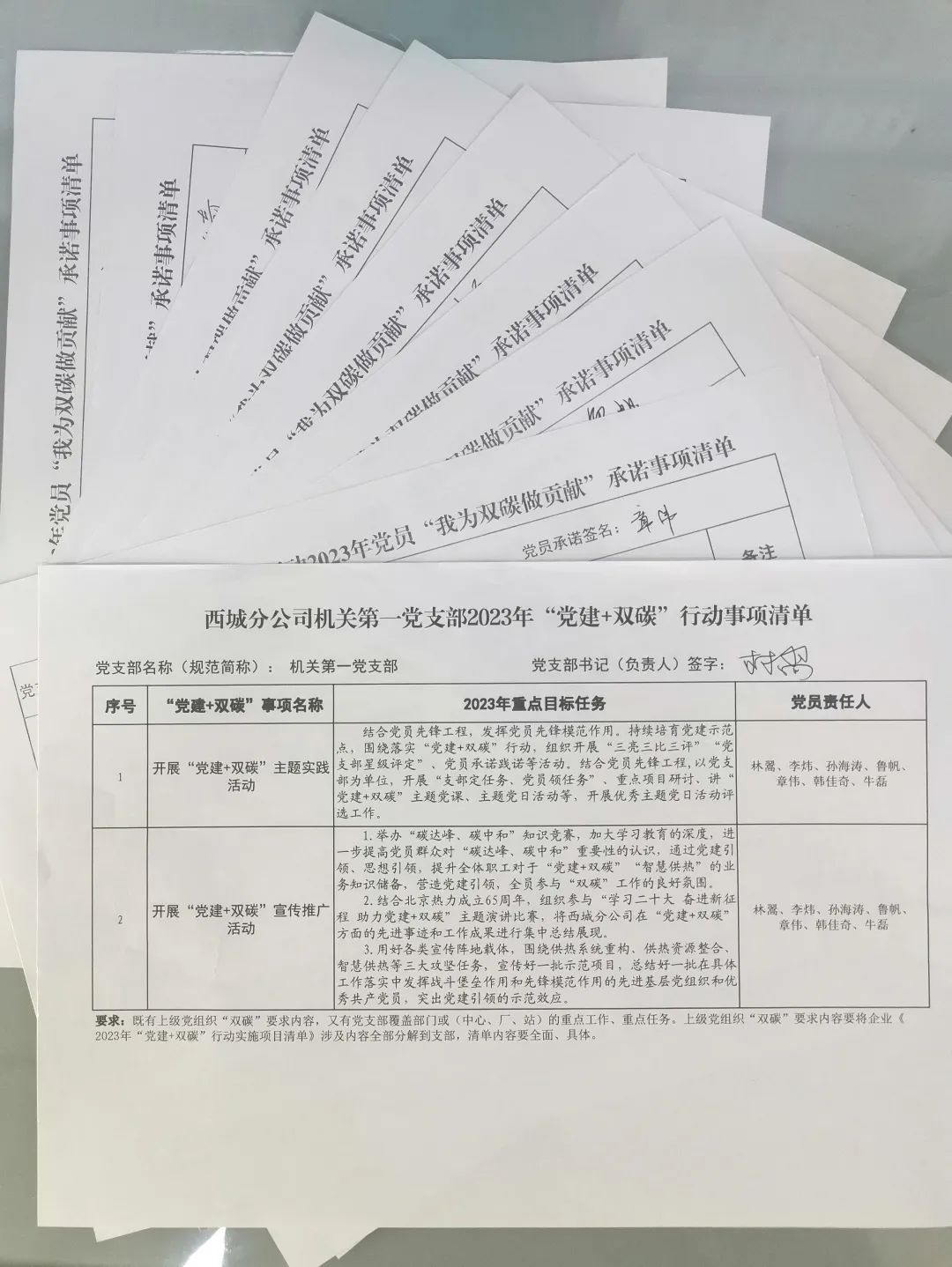 西城分公司党委制定了“党建+双碳”行动事项清单10项;党支部制定了本级“党建+双碳”行动事项25项;137名党员结合工作实际,参与“我为双碳做贡献”活动,承诺事项共计636项。