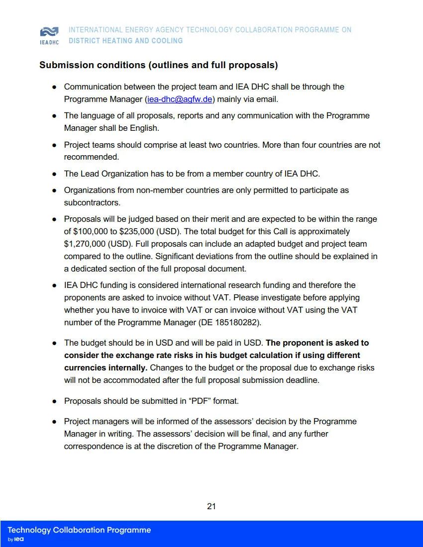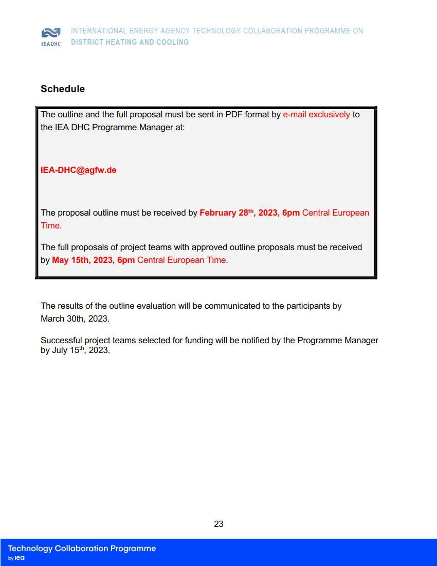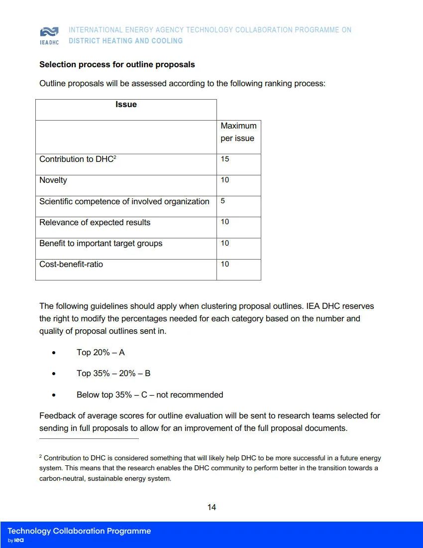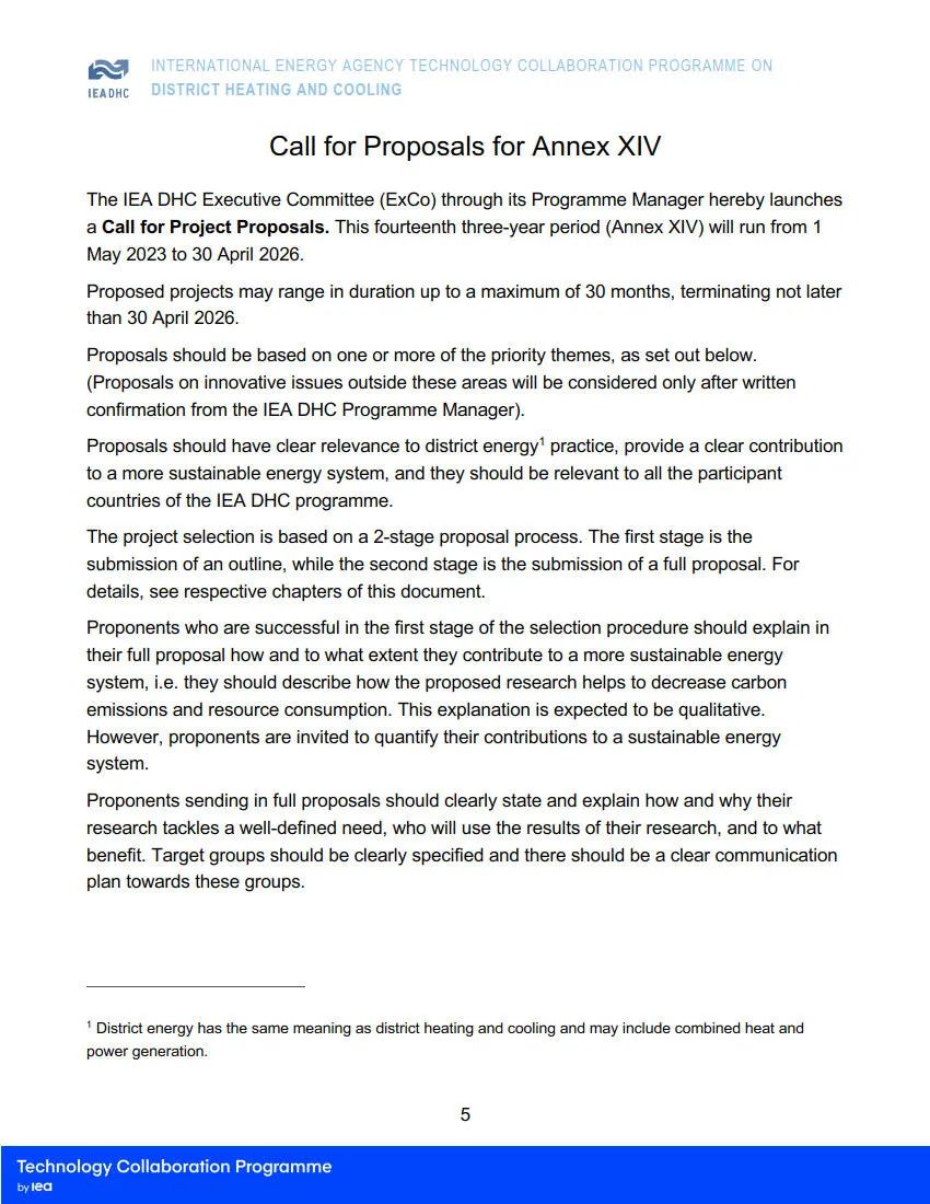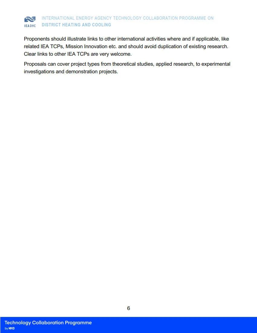 近日,国际能源署(IEA)发布《国际能源署技术合作区域供热和供冷方案征求建议书(2023-2026年)》,就IEA Annex XIV征集项目申请。预计资助6-8个项目,每个项目最高资助金额22万欧元,有意向的专家可组织团队申请。