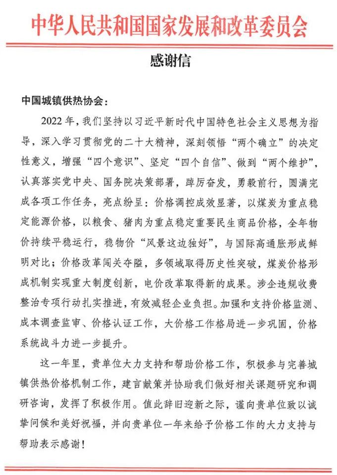 国家发展和改革委员会的一封感谢信