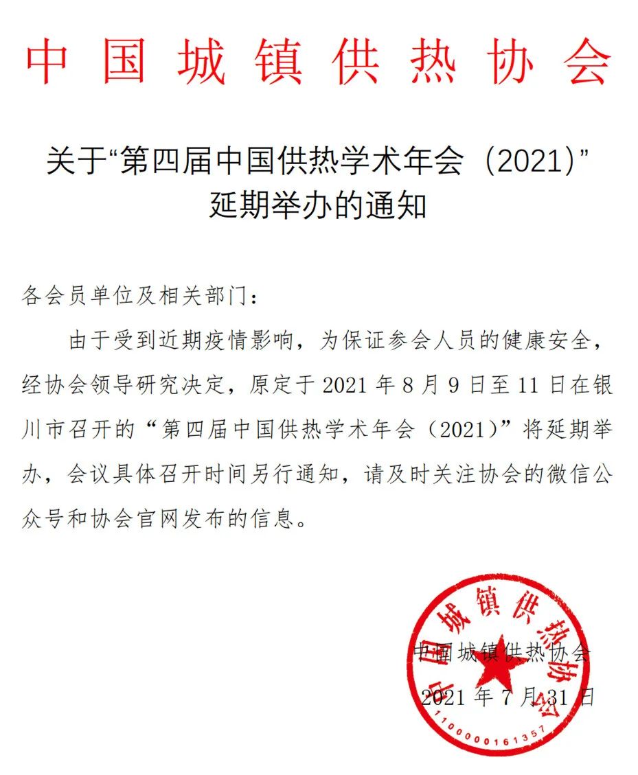 由于受到近期疫情影响,为保证参会人员的健康安全,经协会领导研究决定,原定于2021年8月9日至11日在银川市召开的“第四届中国供热学术年会(2021)”将延期举办,会议具体召开时间另行通知,请及时关注协会的微信公众号和协会官网发布的信息。