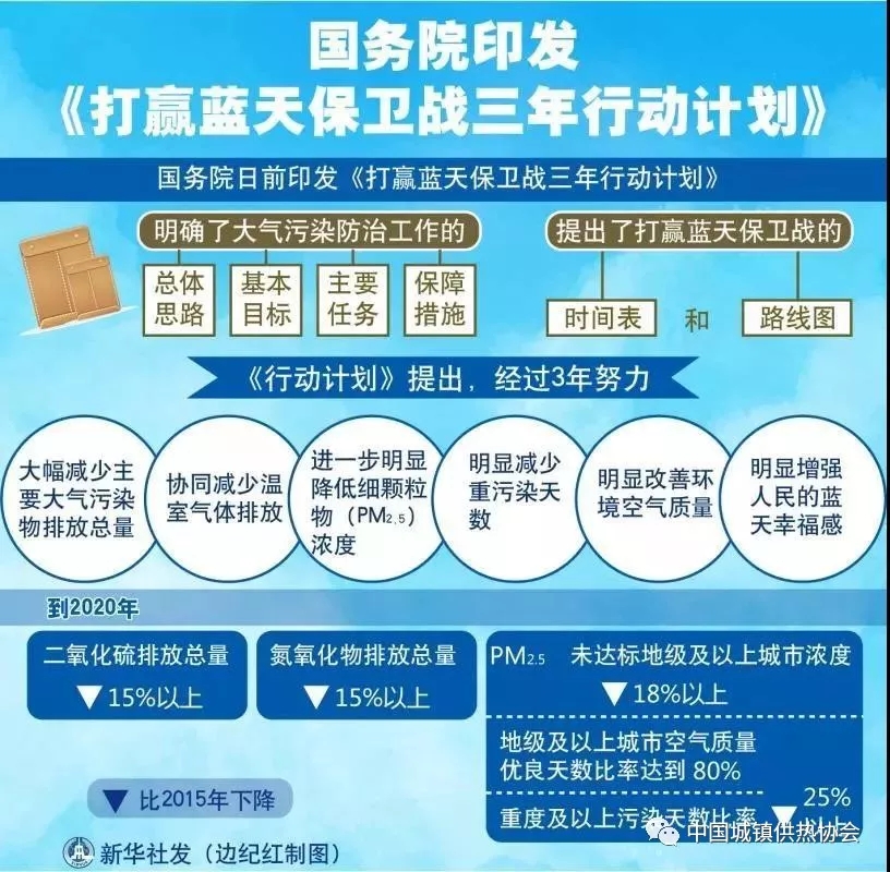 2018年7月4日,中国国务院印发《打赢蓝天保卫战三年行动计划》,将有效推进北方地区冬季清洁取暖作为打赢蓝天保卫战的重要措施,重点推进京津冀及周边地区、汾渭平原的散煤治理,提出从实际出发,宜电则电、宜气则气、宜煤则煤、宜热则热,如天然气、电能、工业余热、可再生能源(生物质能、太阳能、地热能等)多种能源互补利用,各地因地制宜,选择采取多样化清洁取暖方式。