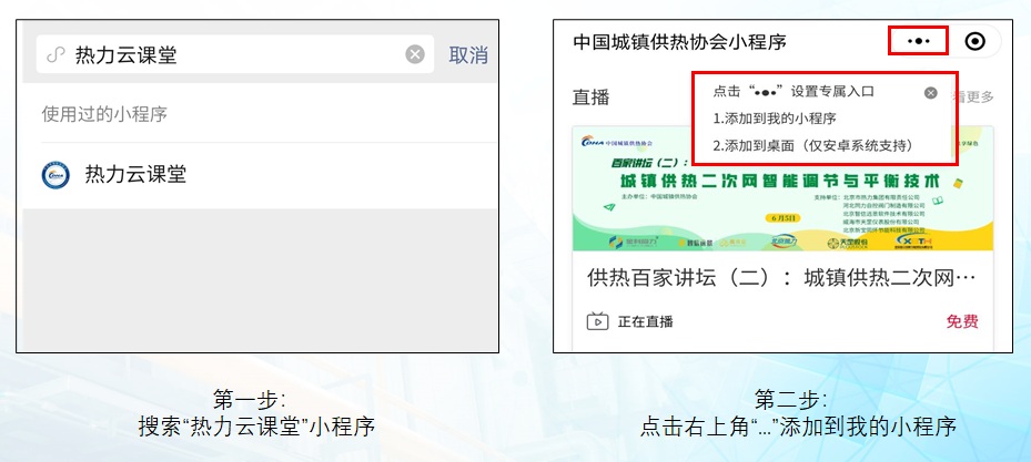 直播平台微信小程序“热力云课堂”近日上线试运行,大家可以在微信小程序中搜索“热力云课堂”,点击“添加到我的小程序”,就可以通过微信小程序观看直播及回放内容。