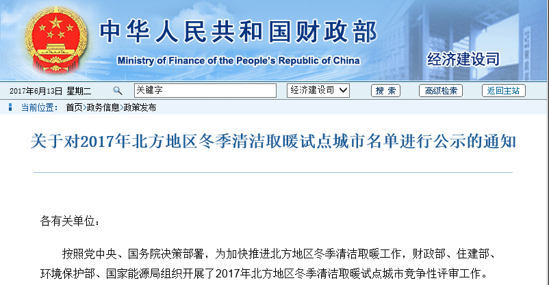 按照党中央、国务院决策部署,为加快推进北方地区冬季清洁取暖工作,财政部、住建部、环境保护部、国家能源局组织开展了2017年北方地区冬季清洁取暖试点城市竞争性评审工作。