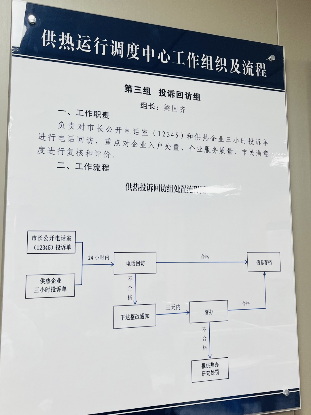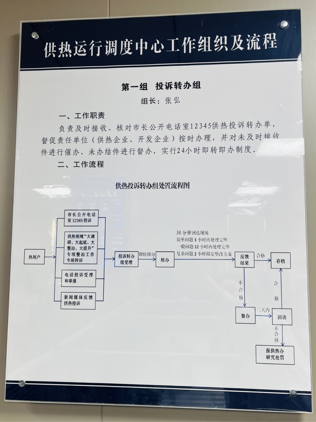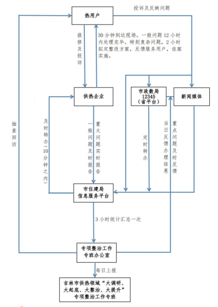 二是完善投诉办理流程。制定《吉林市供热服务手册》,编撰供热投诉处置流程图、供热突发事件应急处置工作流程图,建立“投诉10分钟内受理转办、工作人员30分钟内到达现场、简单问题3小时内处理完毕、一般问题12小时内处理完毕、复杂问题2小时内制定方案及时反馈”的处置机制和每3小时调度、汇总、上报机制,真正做到受理转办、处置解决、办结反馈全流程闭环管理。